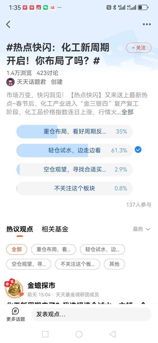 我在#热点快闪:化工新周期开启!你布局了吗?# 选择了“轻仓试水,边走边看” 。看好化工的后续走势。