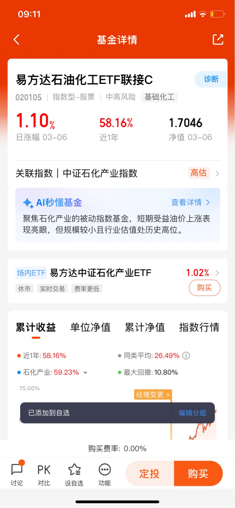 我是易方达基金的铁杆粉丝,布局化工板块我首选$易方达石油化工ETF联接C$ 。