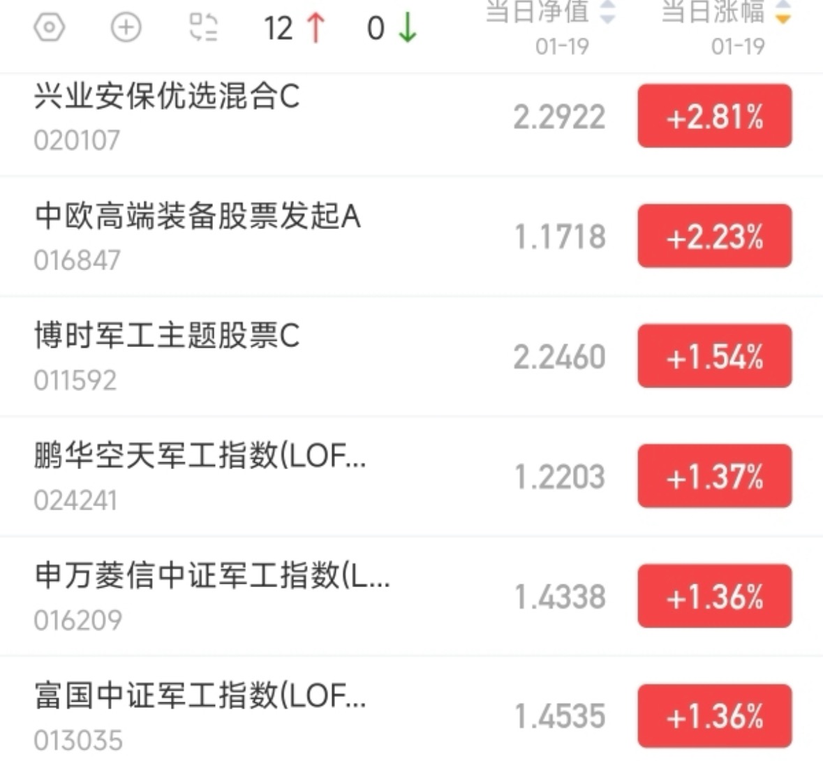 军工这一波表现不错,今天市场板块大部分都是回落的,可是我的$兴业安保优选混合C$ 今天却又是大涨,目前估值已经上涨2.81%,非常不错