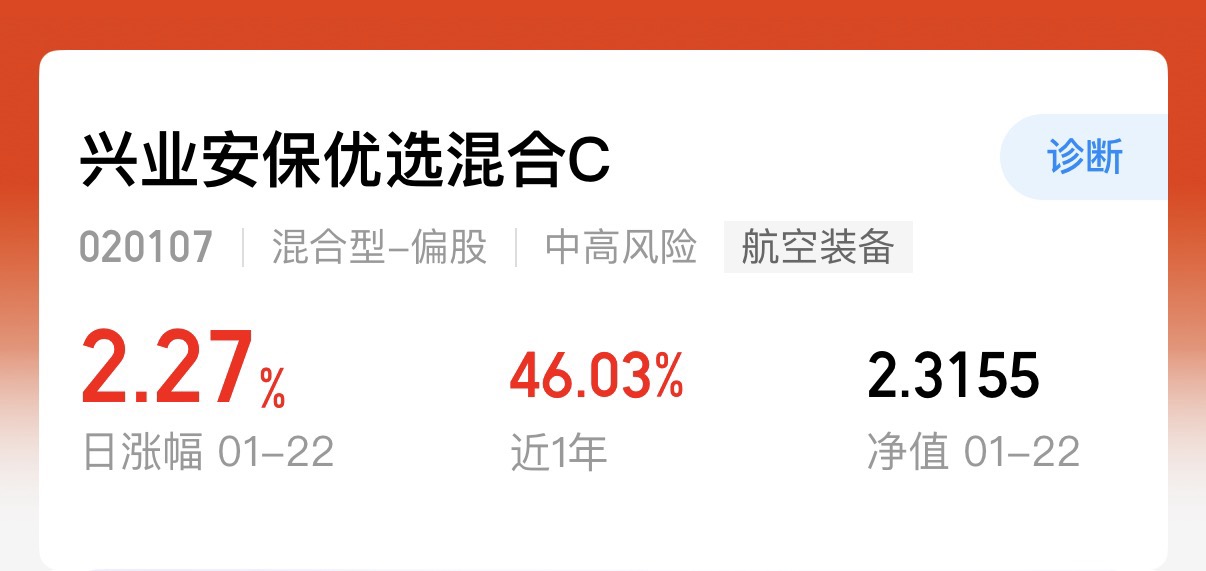 今天大盘低开高走,截至现在是收红的,从盘中来看军工板块,今天是强势领涨,涨幅也都是靠前$兴业安保优选混合C$ 今天又吃肉了,真不错