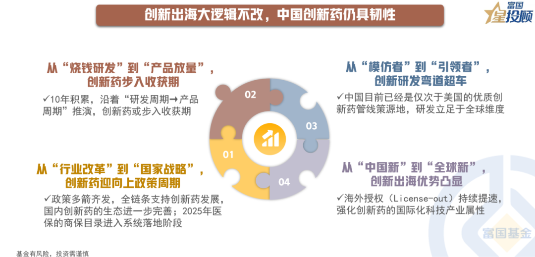 整体而言,本轮创新药行情的核心驱动是BD出海,近年来海外药企持续在国内寻找创新药的BD机会,这种趋势是国内中国工程师红利的体现,也是中国药企发挥全球创新研发新中心优势的结果。在“政策大力支持+产品放量验证+外部风险可控”的基础上,创新+出海大逻辑不改,创新药产业向上趋势不变,行情难言触顶。短期来看,过往全球创新药产品授权合作在下半年更为密集,积极关注研发进度和BD可能。