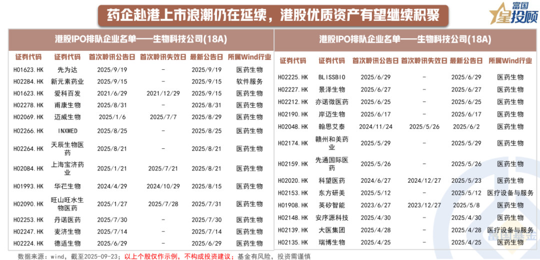 在政策支持、市场环境变化和企业需求等因素的作用下,当前中国企业赴港上市浪潮仍在延续,港股创新医药优质资产有望持续积聚。截至2025年9月23日,港交所处理中的238家上市申请中包含26家18A生物科技公司。