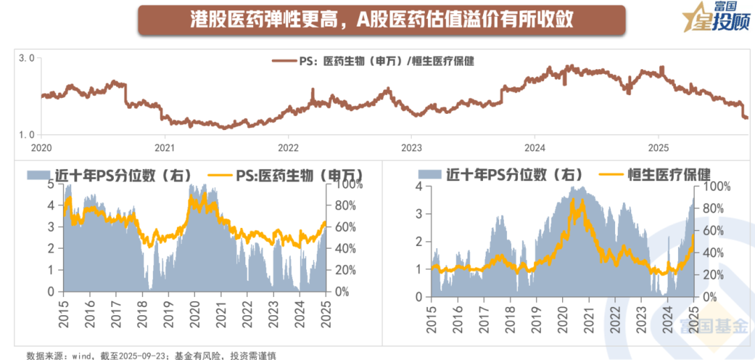 由于A股及H股流动性差异,以及较多中国内地市场参与者偏好交易A股医药,A股医药较港股医药享受一定估值溢价。不过,今年以来受南下资金持续流入等驱动,A股相对港股的估值溢价持续收敛,截至2025年9月23日,A股医药生物相对恒生医疗保健的PS估值处于近十年8.84%分位,相对估值性价比有所凸显。港股医药在美联储降息背景下,对流动性改善或更为敏感,但降息路径分歧之下还需关注进一步宽松信号。
