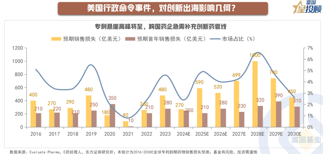 业内普遍认为行政令草案的落地难度较大,核心逻辑在于BD交易的买方—MNC(跨国药企)拥有强大的内在驱动力。据Evaluate Pharma估计,2028年全球专利到期药物预测销售损失高达1000亿美元。在海外MNC重磅单品陆续迎来专利悬崖背景下,MNC亟需通过BD的方式来维持其产品管线生命线,而阻止其BD中国资产,等同于强迫MNC在竞争中“自缚双手”。因此,行政令草案或以短期情绪冲击为主,不改BD大趋势。
