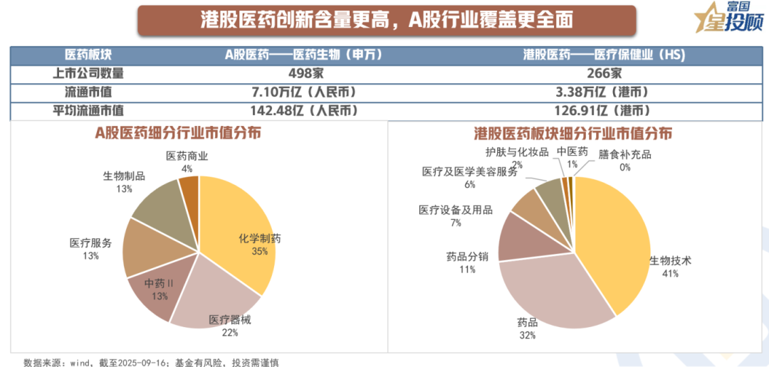 从数量看,A股医药公司数量近500家,约为港股的两倍。从行业分布看,港股医药分布相对更集中,生物技术、药品合计市值占比高达73%;同时,创新药概念股在港股医药板块中市值占比超60%。A股医药板块覆盖更为全面,不仅对化学药品、医疗器械覆盖比重高,且在医疗保健设备、中药等传统领域也有较强的代表性企业。