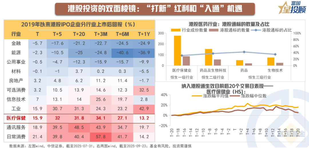 相比当前A股,港股创新药投资存在两重潜在收益,内地投资者可通过开港股券商账户或借道QDII基金来实现。其一,“打新”红利,从历史数据看,2019年以来,港股IPO企业平均回报较好;分行业看,医药等成长板块IPO回报较高,凸显成长赛道在新股定价中更易获资金溢价认可。其二,“入通”机遇,根据历史数据,生效日前后,新纳入的港股通标的有具有一定超额收益的潜力。截至2025年9月23日,恒生一级行业医疗保健业的277只成份股中,港股通标的有86只,占比31%。通过前瞻性布局尚未纳入港股通的潜力企业,有望把握其未来“入通”可能带来的流动性提升与估值重构机会。