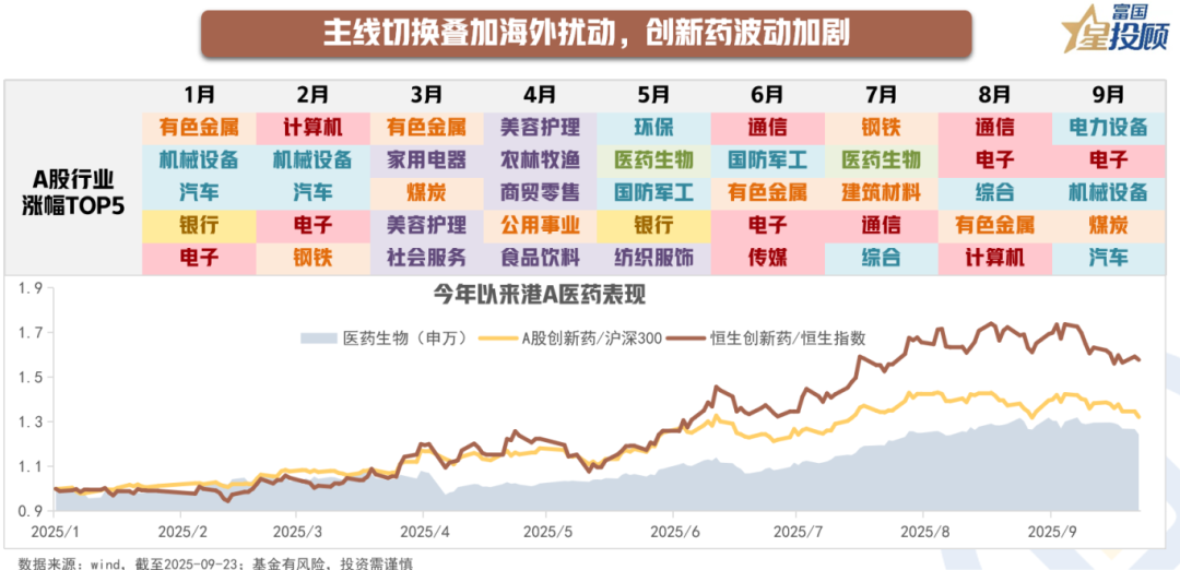 截至2025年9月23日,今年以来A股医药生物(申万)累计涨22%,期间最大回撤14%,恒生医疗保健指数累计上涨91%,期间最大回撤26%,展现出比A股更高的弹性。