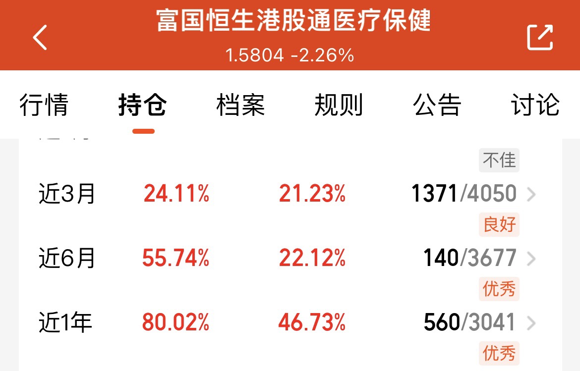 大盘今天分化得挺明显,科技板块没扛住开始调整,但创新药板块完全不受影响,还在接着大涨!$富国恒生港股通医疗保健ETF发起式联接C$ 也没让人失望,今天估值继续反弹上涨。翻了翻它的业绩,近一年大涨 80.20%,而且不管是之前哪个阶段,业绩都很出众。再想想港股创新药现在的估值,本来就处于低位,后面能涨的空间还大着呢,选这只基金真是选对了!