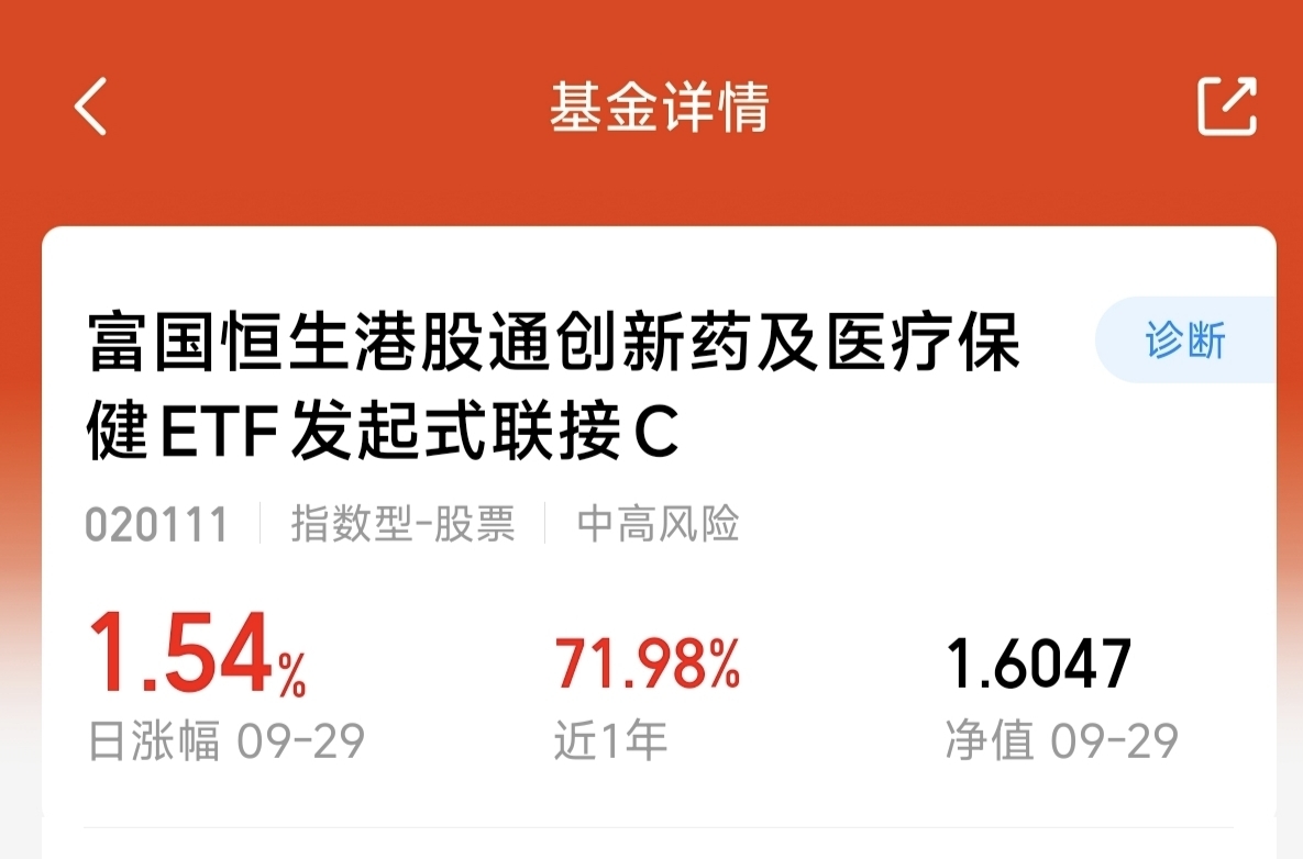 反弹真的来了!之前那波调整已经妥妥到位,现在正是布局的好时候,千万别错过!富国恒生港股通医疗保健 ETFC 表现超给力,今天估值直接大涨 1.98%,更厉害的是近一年直接涨了 71.98%,这收益太让人安心了。我继续看好节后的趋势,现在入手或者加仓都合适,就等着后续大丰收,跟着这只基金准没错!$富国恒生港股通创新药及医疗保健ETF发起式联接C$ $广发港股创新药ETF联接(QDII)A$ $广发港股创新药ETF联接(QDII)C$
