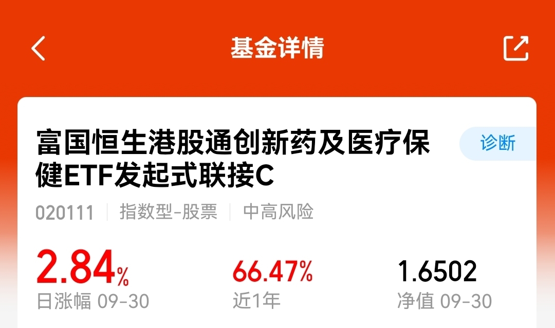 长期赛道不改,港股创新药估值有优势,确定性强。节前布局,分批买入,拿住就对了,时间会给答案。$富国恒生港股通创新药及医疗保健ETF发起式联接C$ 不错啊,又涨2.84%,2连涨!