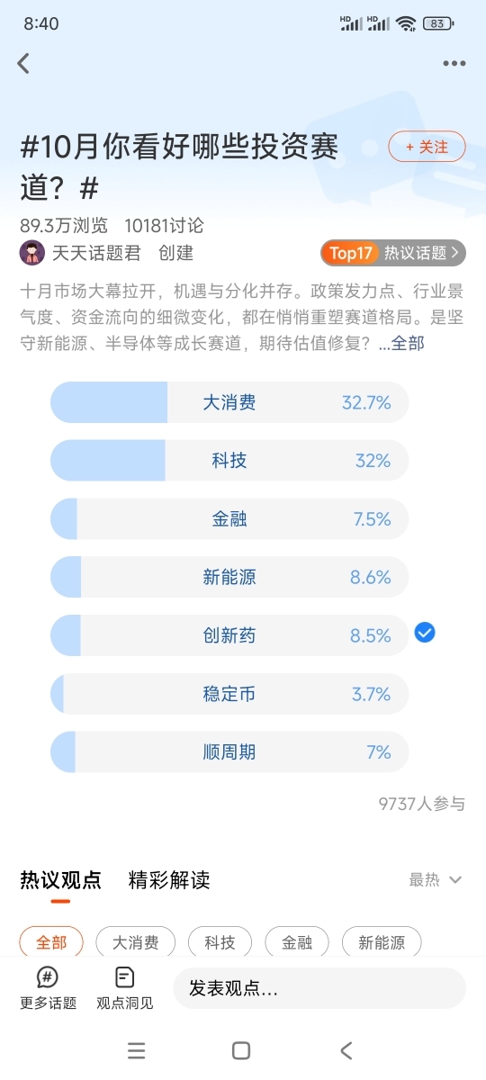 我在#10月你看好哪些投资赛道?# 选择了“创新药”,要是关注医药投资,最近肯定能感觉到,创新药板块经过两年多的调整,性价比是越来越突出了。之前因为美联储加息、医保控费这些因素,不少创新药企股价跌得厉害,行业估值也到了历史低点,不少投资者都有点慌。但现在再看,这种短期调整反而给了布局机会,不管是从估值还是基本面看,配置价值都很亮眼。