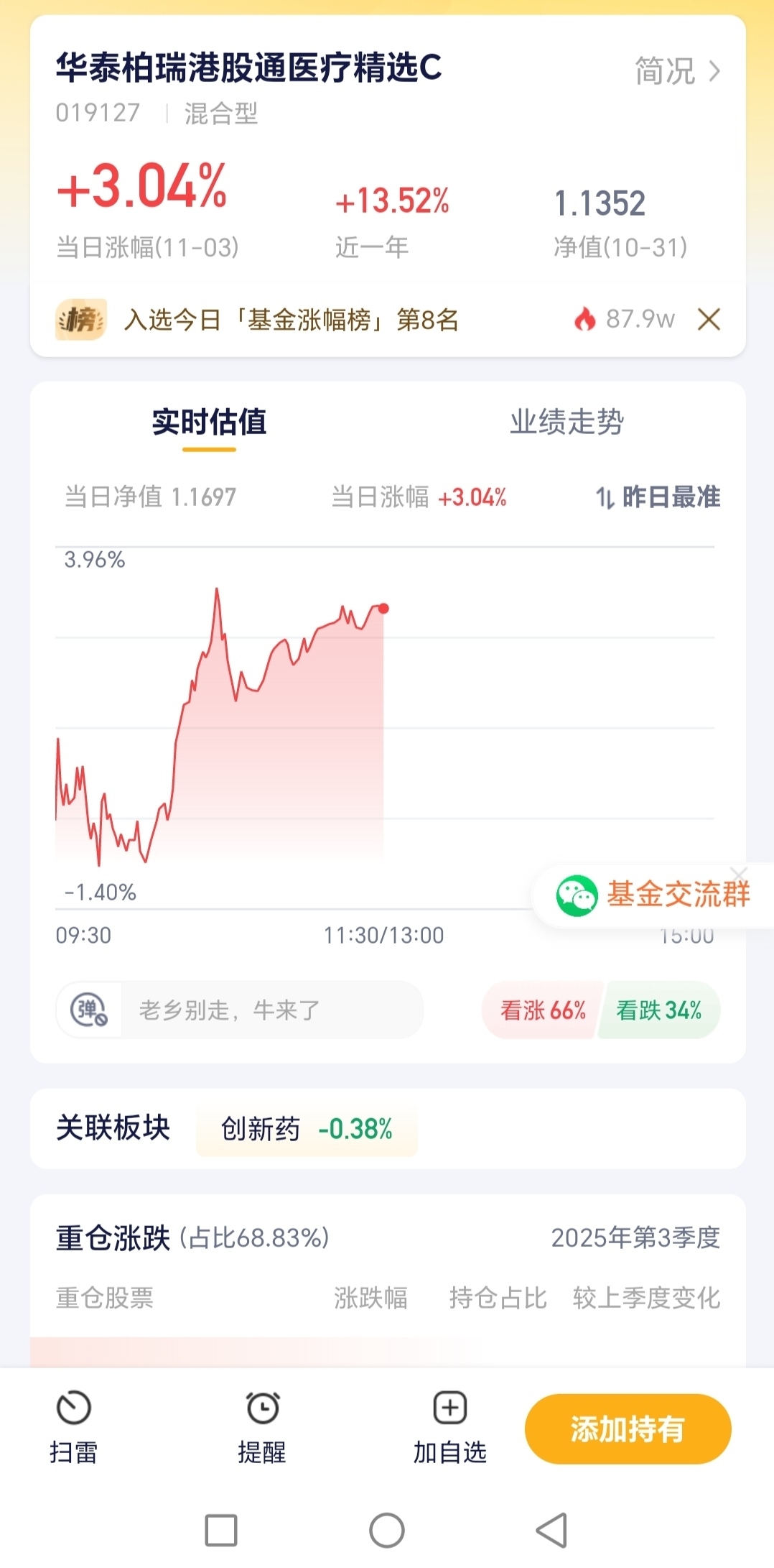 友友们,今天创新药跌了0.38%,华泰柏瑞涨了3.04%,近一年涨13.52%,还入选今日涨幅榜第8!它专做港股医疗精选,在医疗赛道表现突出。医疗行业需求持续,港股医疗标的吸引力大,华泰柏瑞这只基是布局医疗的好选择,说不定能在医疗行情中给你带来惊喜。$华泰柏瑞港股通医疗精选混合发起式C$ #11月基金投资策略#