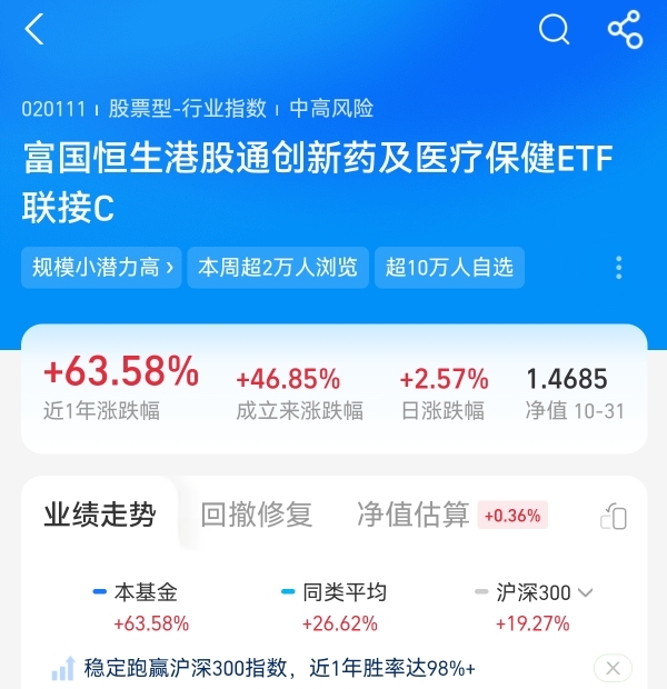 今天三大指数集体调整前面热门科技半导体等继续回调,低位创新药接力了!$富国恒生港股通创新药及医疗保健ETF联接C$ 近期呈震荡调整后反弹态势,业绩随板块行情波动明显。看历史业绩上个交易日逆势收涨2.57%表现给力,近一年63.58%也是优秀的评级。