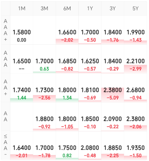 资金面上,公开市场今天延续净投放。央行连续两天开展1000亿的14天期逆回购操作,呵护资金面的态度明确,叠加常规7天逆回购到期与投放,流动性净投放357亿元。重要资金价格变化不大,仍然利好债市。