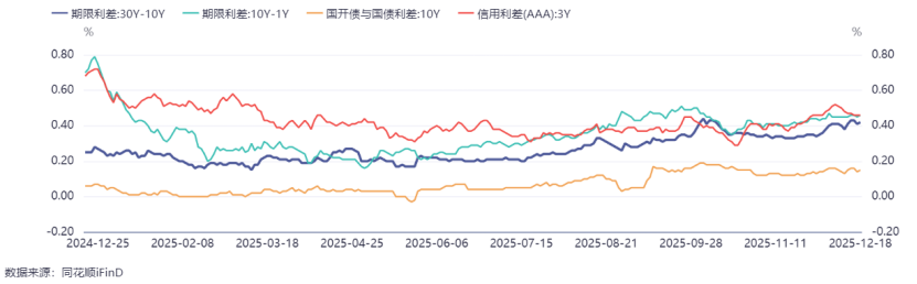 债市今天延续回暖!目前十年期国债活跃券收益率下行近1BP,下破1.84,超长端下破2.23,长端利率债的短期趋势进一步修复。国债期货全线上涨,信用债也是大面积翻红,债市今天可谓是暖意十足。期限利差有所反弹。