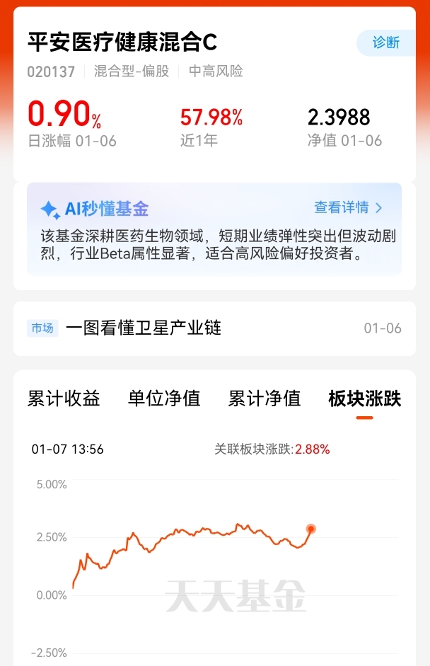 板块轮动起来,医疗也争气了,行情真的是越来越好了,毕竟医药跌不少了,估值都比较低,医药行业在2026年将迎来产业、政策与资本周期的共振,中国创新药有望迎来业绩拐点与估值重塑,同时医疗器械行业政策影响减弱,出海快速增长,企业业绩有望修复,这时候得拿稳了,$平安医疗健康混合C$ 今日保持上涨,拿好了。