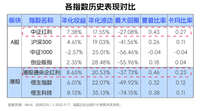 如下表所示,自2016年以来,A 股、港股的红利资产,在 “收益、波动、回撤” 三个维度都展现出明显优势: