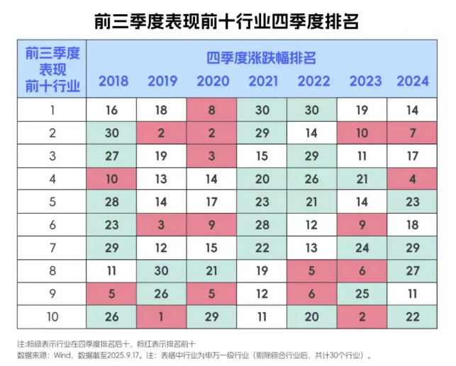 历史数据统计发现,四季度或是板块切换窗口期。以申万一级行业为例,2018-2024年期间,前三季度表现前十的行业,四季度有超半数会跌出前十(标绿为后十,标红为前十),而红利这类低波动板块,过往一般能在切换中稳住阵脚。