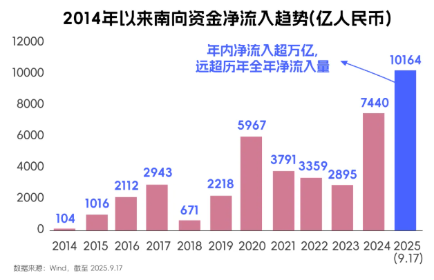 南向资金持续加仓:年内南向资金累计净流入 10164 亿元,远超历年任一年度全年净流入,资金增配意愿强烈,有力推升港股估值;