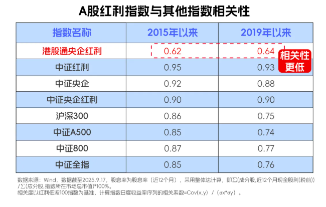 分散风险效果好:港股通央企红利与 A 股指数的相关性较低,这意味着,如果您的资产配置中A股较多,那么持仓里增加一点港股红利,或能帮助降低组合整体波动。