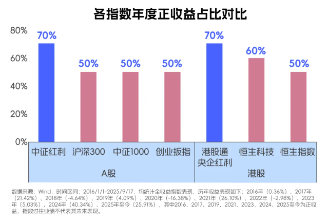 从年度正收益情况来看,A 股、港股红利指数在过去十年中有70%以上的年份能实现正收益,相比科技成长的 “大起大落”,红利资产带来了更良好的持有体验。