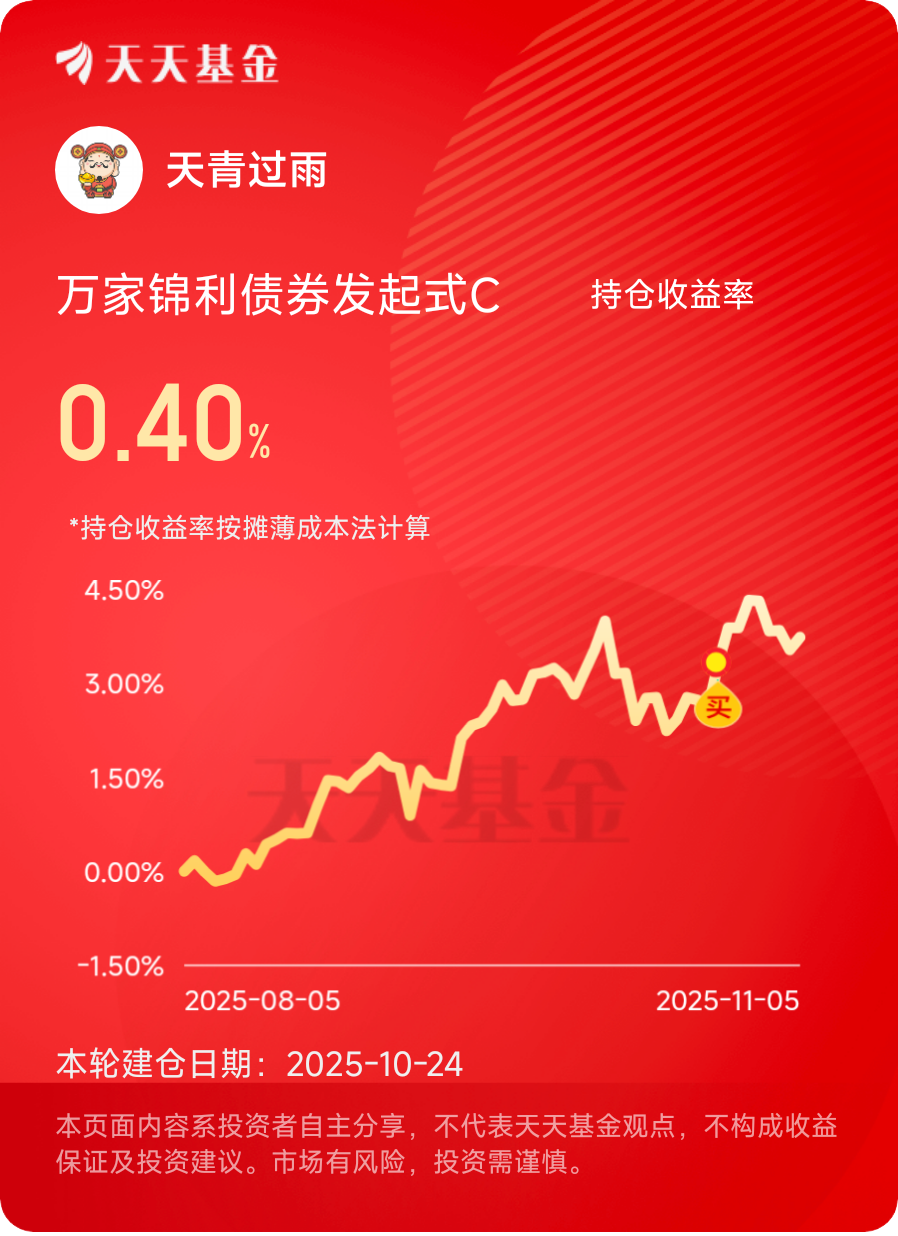 跟了好长时间,中间也有起伏,但它权益仓位的配置让我坚信它潜力大$万家锦利债券发起式C$ #晒收益#
