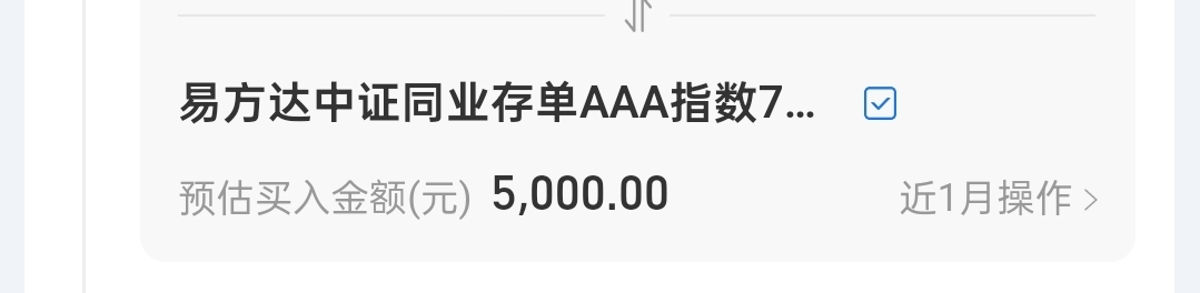 $易方达中证同业存单AAA指数7天持有$ +5000,年底了,还是稳着点来,最近感觉同存单真不错,就算最近股债行情震荡,也丝毫没有影响,从9月底到现在没有丢过蛋,月月正收益,超级稳。拿了挺久的,体验感很不错,当做底仓放着非常安心,属于货币版增强,波动和收益在货币和短债之间的类型,走势非常稳,收益也不错。急用的话,7天就可以随时出来了,对于不想丢蛋,又想参与配置的来说,把闲钱往同存单里存着也非常香,波动走势也非常平稳,今天继续补仓15000放着了,放着过年啦,比直接放余额宝收益高许多。