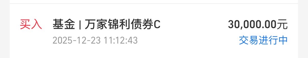 固收+:$万家锦利债券发起式C$ $+30000元,万家锦利昨天收31个蛋,太棒了,今天看持仓又是吃肉的一天,万家锦利上车以来天天产蛋,而且这产蛋量大,今天继续大额补仓3万。这是一只中波动固收+策略,而且是7天免申赎费用,灵活度高,拉长时间看业绩很不错,近6个月收益757个蛋,近一年收851个蛋,每个阶段的业绩都起过了同类平均水平,可见这支业绩很不错。这支主要投资债券占比84.68%为稳健底仓,再灵活搭配少量股票占比17%来提高收益,因定配置量化红利,自由现金流外,持仓集中在算力,新能源和铜铝有色板块,持仓全面来应对市场变化,整体看好明年科技板块继续走强,后续还是以布局固收+策略的为主,万家锦利持仓6万持有体验不错,今天再继续补仓3万。