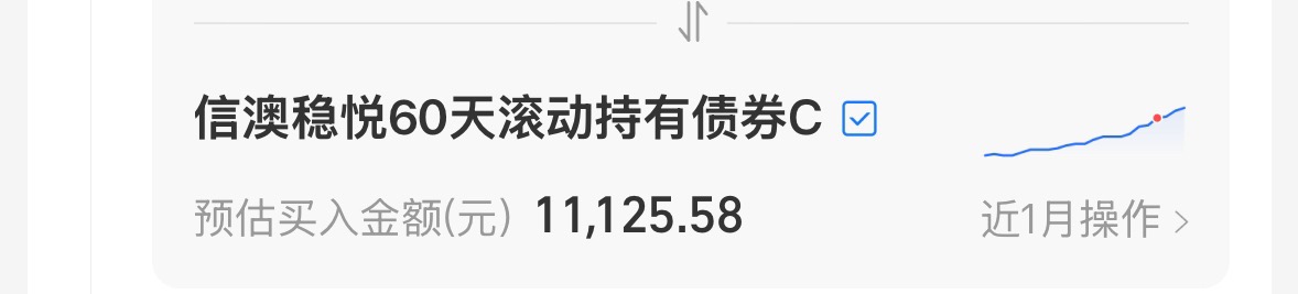 最近债市总算从之前的调整里缓过来了,长端和短端收益率都往下走,资金面也一直比较宽松,央行持续做逆回购,把市场的流动性稳稳托住。在这种环境下,中短债的表现相对更稳一些,整体配置性价比还不错。我继续加一笔信澳稳悦60天滚动持有债券C,它主投中短债,属于偏稳健的纯债策略,信用债占比88.87%,搭配7.21%利率债灵活捕捉波段机会,行情稍好收蛋能力强,近一周多次收蛋4个以上,之前债市回调的时候,它抗波动的能力优秀,12月以来一直没绿过,各阶段都能保持正收益,走势比较平滑。从业绩来看,近一年涨了3.05%,不仅比余额宝高了几倍,还大幅跑赢了同类产品,阿诗今天继续加10000元~