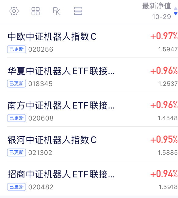 今天大盘走势不错,大科技继续发力,尤其是机器人板块,盘中拉升了不少,今晚的$中欧中证机器人指数发起C(OTCFUND|020256)$收涨+0.97%,涨幅靠前业绩突出了,值得期待啦!