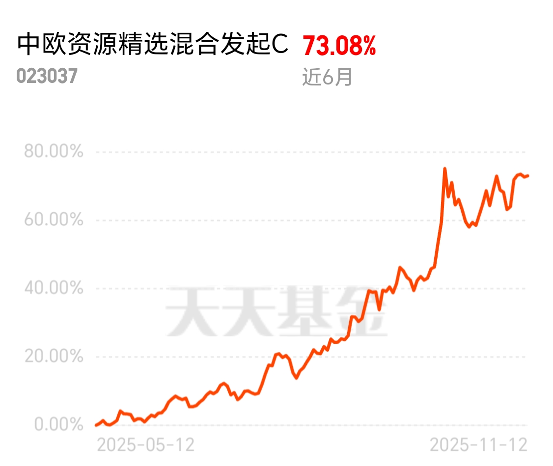 现在大家买基金都看重赛道潜力,资源赛道无疑是当下热门。中欧资源精选混合C近6个月