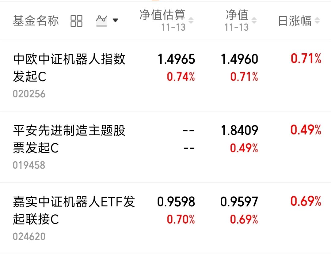 今天的市场行情有许多标签放量突破,创下历史新高,普涨行情主线比较清晰。今天的机器人板块表现相对比较一般,但也有相关的基金领涨,$中欧中证机器人指数发起C(OTCFUND|020256)$上涨0.71%,$平安先进制造主题股票发起C(OTCFUND|019458)$上涨0.49%,$嘉实中证机器人ETF发起联接C(OTCFUND|024620)$上涨0.69%。