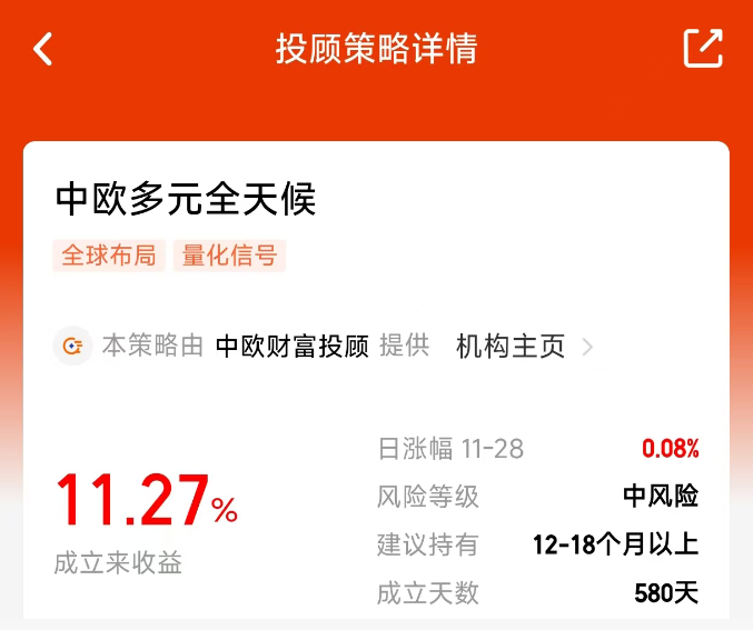 最近市场起伏比较大,不少中低波动产品也出现了不小回撤。我关注的中欧多元全天候在这波波动中显得更从容。它借鉴了桥水全天候的策略思想,并结合国内市场特点做了优化,目前额度也充足。策略上通过美债和中债等固收资产打底,再加上股票、商品等多元化的全球配置,利用不同市场间的低相关性控制波动。近一年收益9.24%,最大回撤2.02%,波动率2.82%,表现比较平稳。在天天基金APP的投顾管家页面,进入“三笔钱投顾”投顾服务就能找到中欧多元全天候。对于希望降低账户整体波动的投资者,值得多看一眼。#今年你的投资目标达成了吗?#