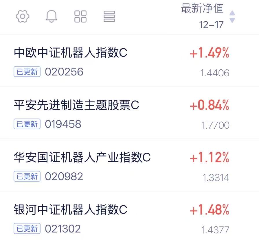 今天A股和港股都反弹回暖了,盘面一片红,科技板块涨幅还是不错的,机器人今天终于吃上肉肉啦,来看看净值更新情况