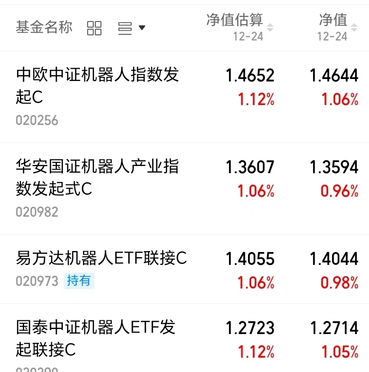 A 股今日整体回暖向好,科技及新能源相关板块走强,机器人板块也是表现不错的呢,机器人产业获国家及地方政策强力扶持,补贴研发+拓展应用,赛道后市空间值得期待的的。一起看看今晚净值更新表现: