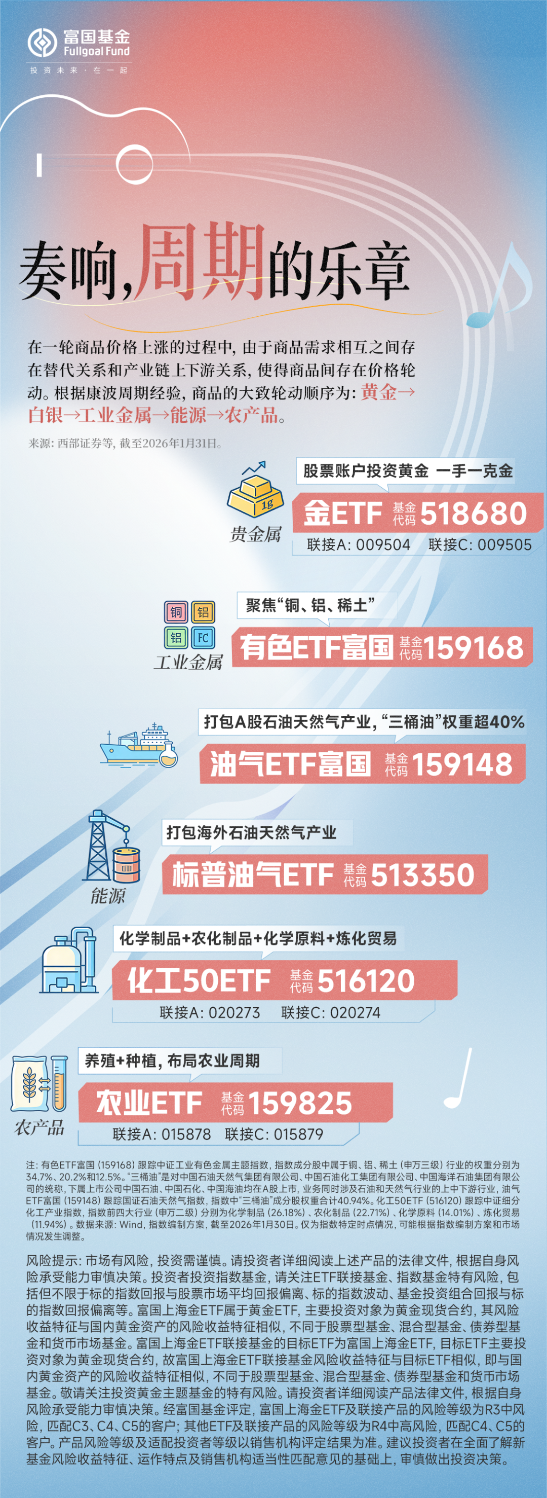 风险提示:以上内容不代表对市场和行业走势的预判,也不构成投资动作和投资建议,且可根据市场情况变化而调整。基金所跟踪标的指数的历史表现不预示其未来表现,不构成对基金业绩表现的保证,请投资者关注指数基金投资风险,包括但不限于标的指数回报与股票市场平均回报偏离、标的指数波动、基金投资组合回报与标的指数回报偏离等特有风险。经富国基金评定,化工50ETF的风险等级为R4,匹配积极型C4、进取型C5的客户。建议投资者详阅基金合同等文件,根据自身的风险承受能力审慎作出投资决策。产品风险等级及适配投资者等级以销售机构评定结果为准。市场有风险,投资需谨慎。