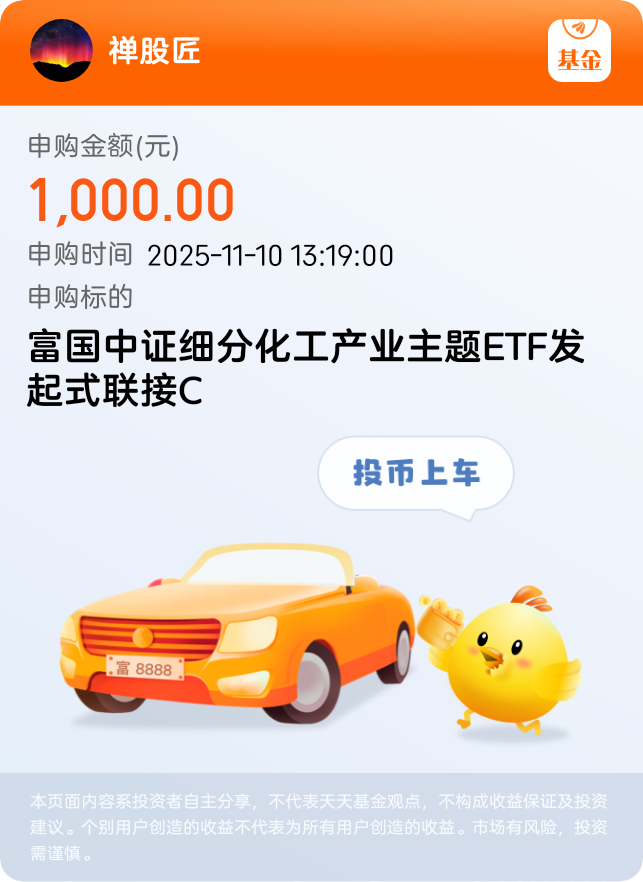 最近行情回暖,化工板块表现亮眼,不少基金大V都在悄悄加仓,我也跟风追了一波富国中证细分化工产业主题ETF发起式联接C(020274)。$富国中证细分化工产业主题ETF发起式联接C$
