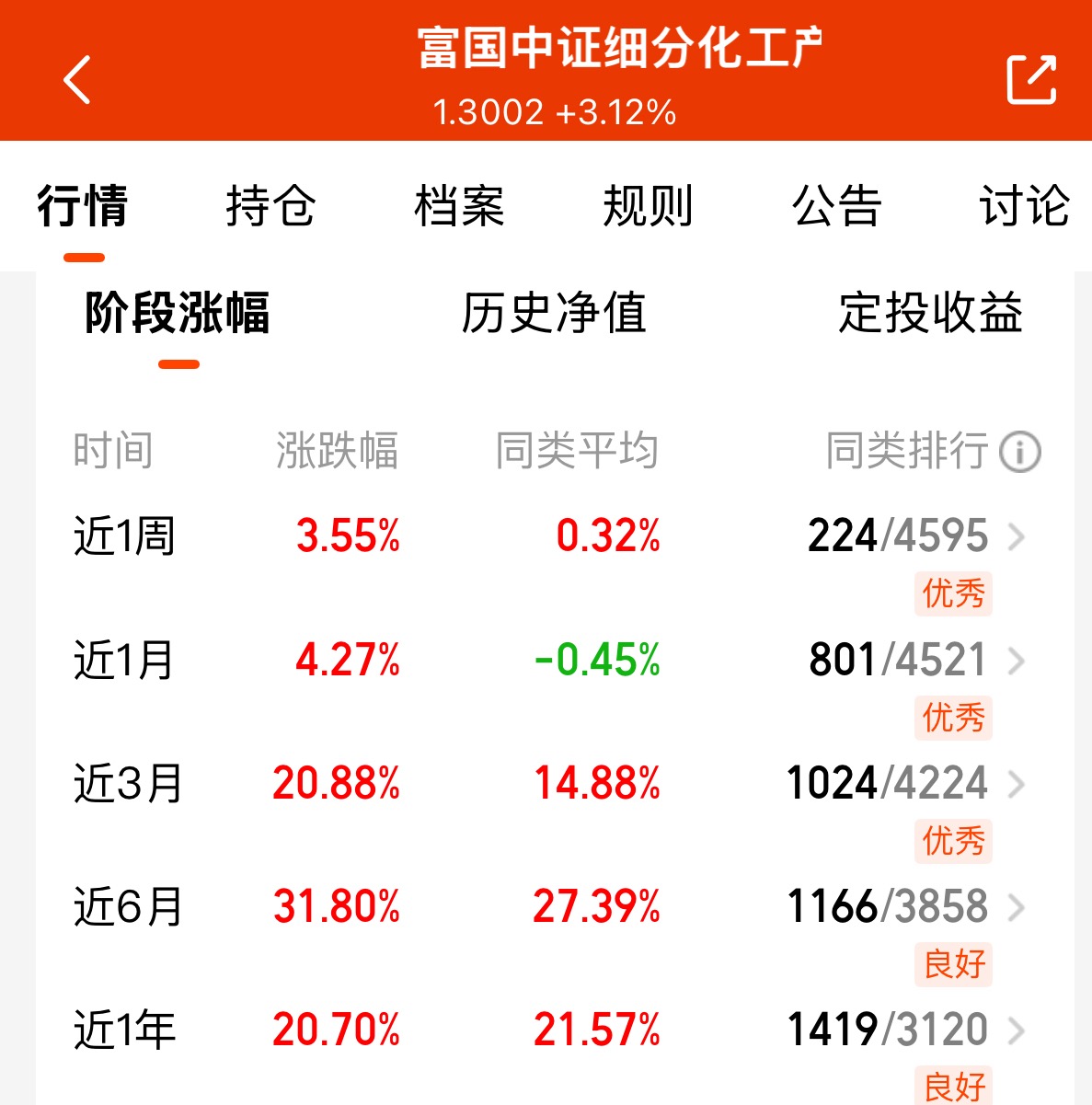 今天市场低开高走,反内卷题材又火起来了,今天我建仓$富国中证细分化工产业主题ETF发起式联接C$ 这个,跟踪化工主题的被动型基金,更能跟上结构性行情,目前在反内卷背景下,化工板块也出现量价提升,这得益于替代需求的出现,以及新能源、电子等新兴应用领域的需求持续增长。需求韧性比较高,政策,技术,需求形成共振,板块上涨逻辑硬气,空间也足,我就提前埋伏上来。