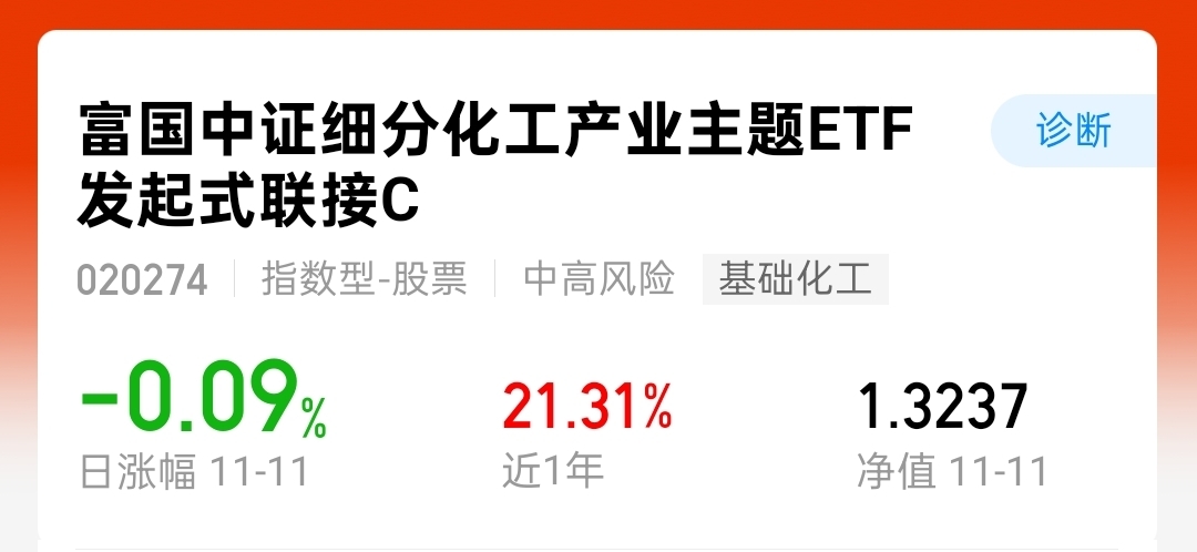 今天市场表现不理想,大部分都在跌,截止午盘化工板块行情分化,相关个股有涨有跌。今天继续加仓$富国中证细分化工产业主题ETF发起式联接C$ ,现在储能、新能源车这些热门领域,对化工材料的需求越来越大,像锂电材料、制冷剂这些都在涨价,行业基本面越来越稳,还是选择继续看好化工板块,保持持有后续多多观察一下。