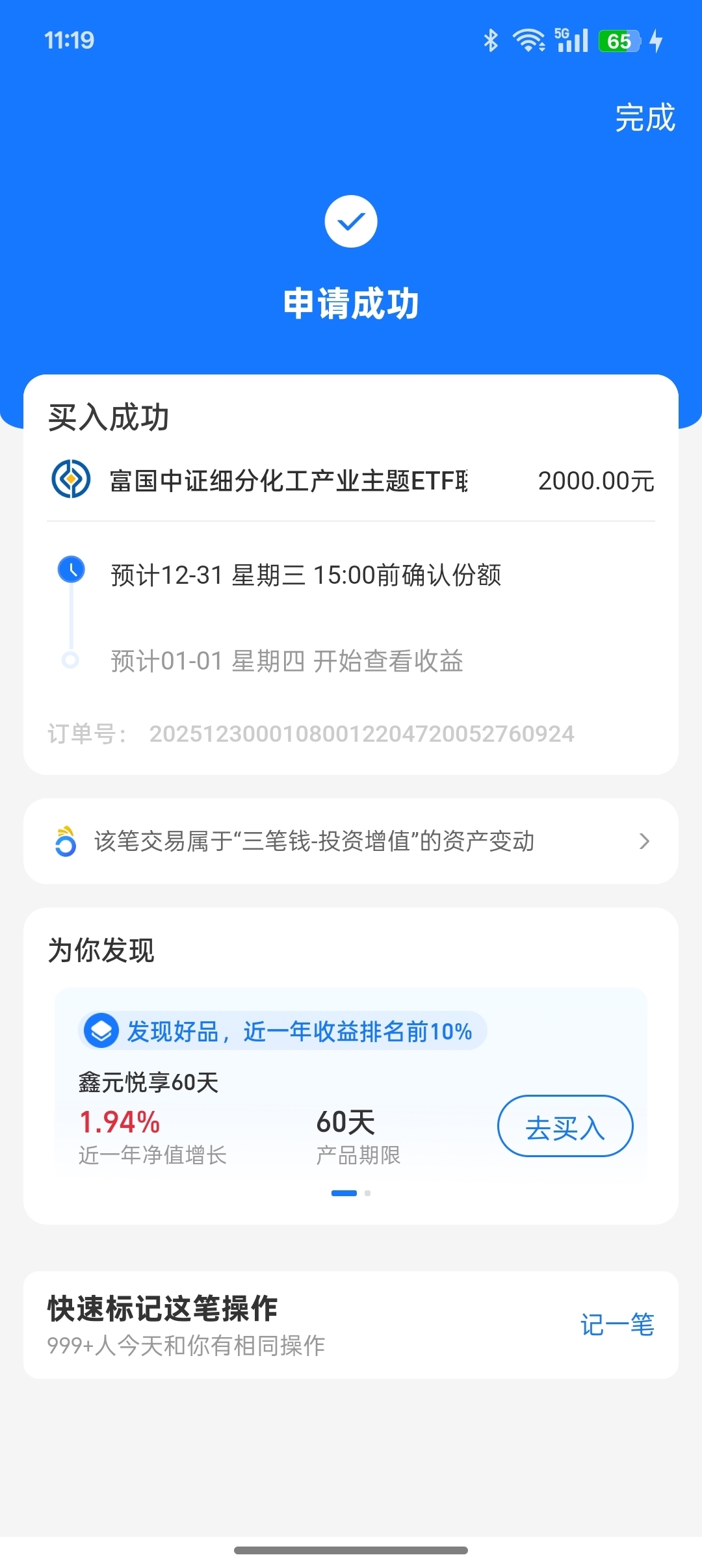 马上又是新的一年了,最近年末化工板块其实表现是很不错的,发力比较明显。今天我加2000$富国中证细分化工产业主题ETF发起式联接C$ ,昨天板块回调,也跟着跌了一个点,不过今天目前来看净值是上涨的,又有希望吃上波肉,近一个月已经涨了8.62%了。现在化工行业正在向高端化转型,优质企业的竞争力越来越强,板块表现力一直在回暖,中长期看来还是有机会的,继续加油。