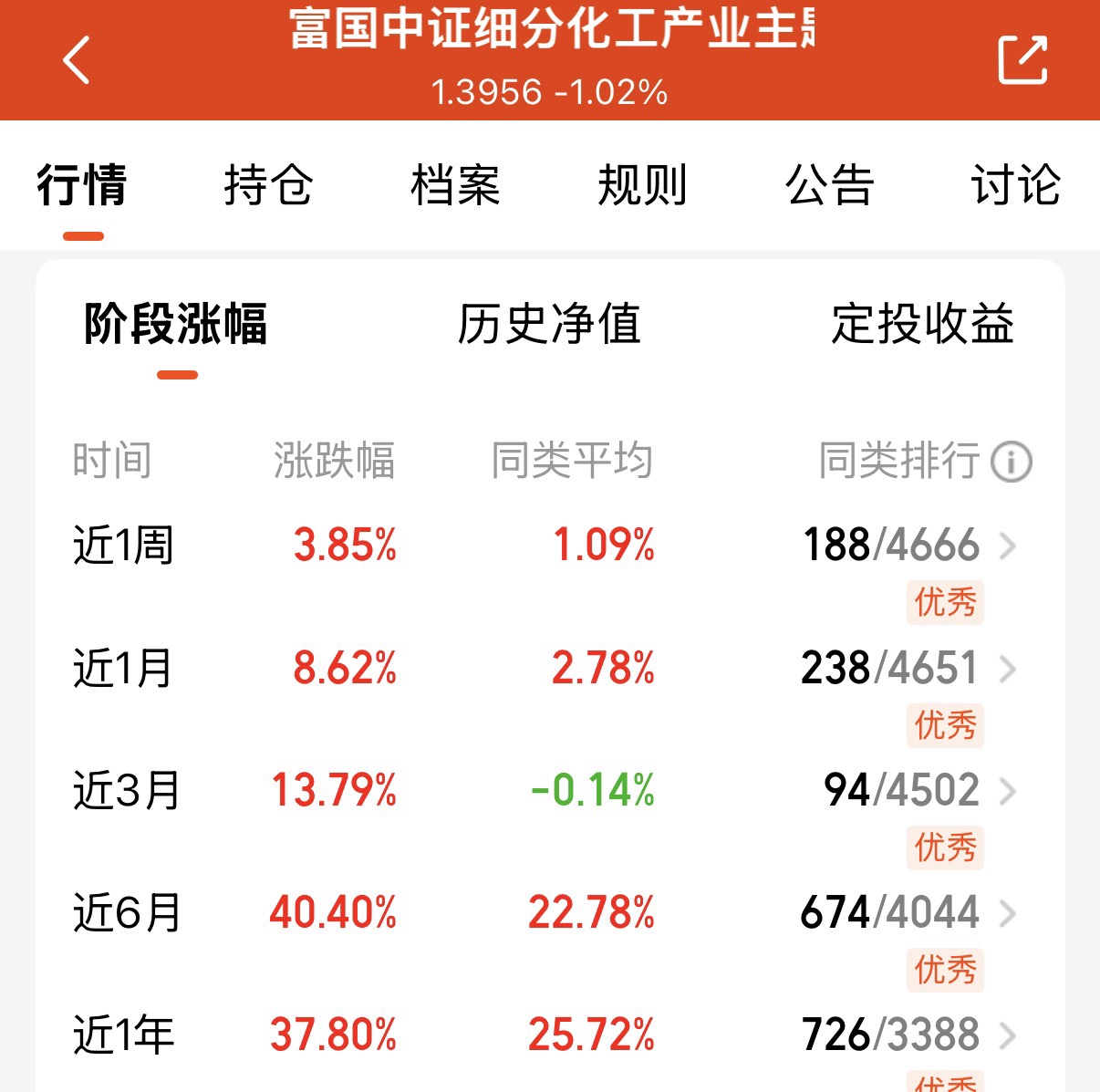 冲4000点的年底行情确实不好做,大家都比较谨慎,那相对有确定性的还是看低位的反内卷方向,我这一份确定性比较较强的$富国中证细分化工产业主题ETF发起式联接C$ ,一个月上涨8.62%,对比同期的化工指数4.5%实现超额了,现在在行业回暖初期,我左侧建仓一波。