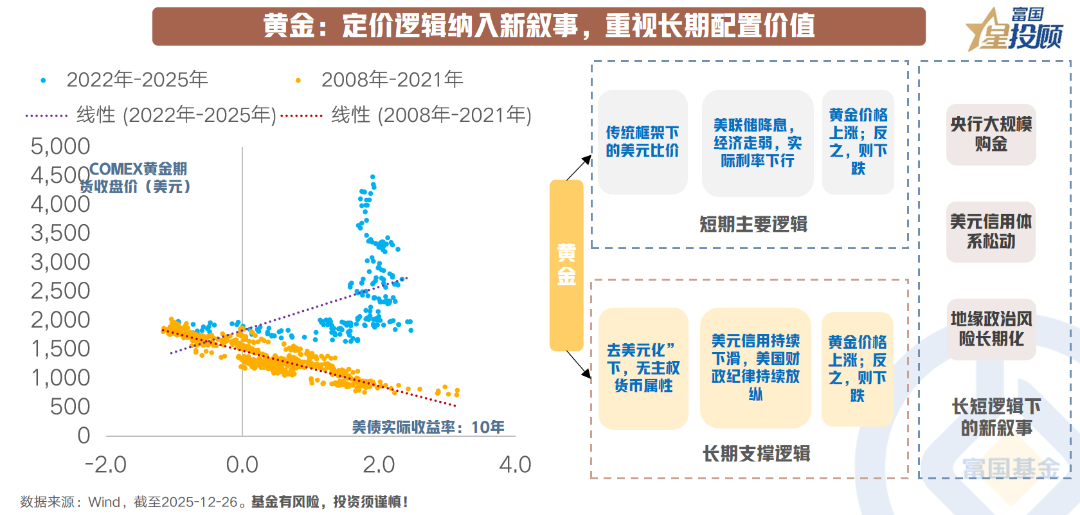 黄金资产定价框架正持续迎来新变化。2008-2021年,美元实际利率衡量的持有黄金机会成本是重要的定价因素,而2022年以来,黄金资产涨幅逐渐超出传统框架解释范围,显示新定价因子的引入,央行购金、地缘风险长期化与美元信用重构成为黄金价格的新叙事。向后看,黄金配置价值依然显著,在弱美元趋势延续背景下,黄金仍具备独特的另类货币属性与避险属性,适宜纳入多元配置组合。