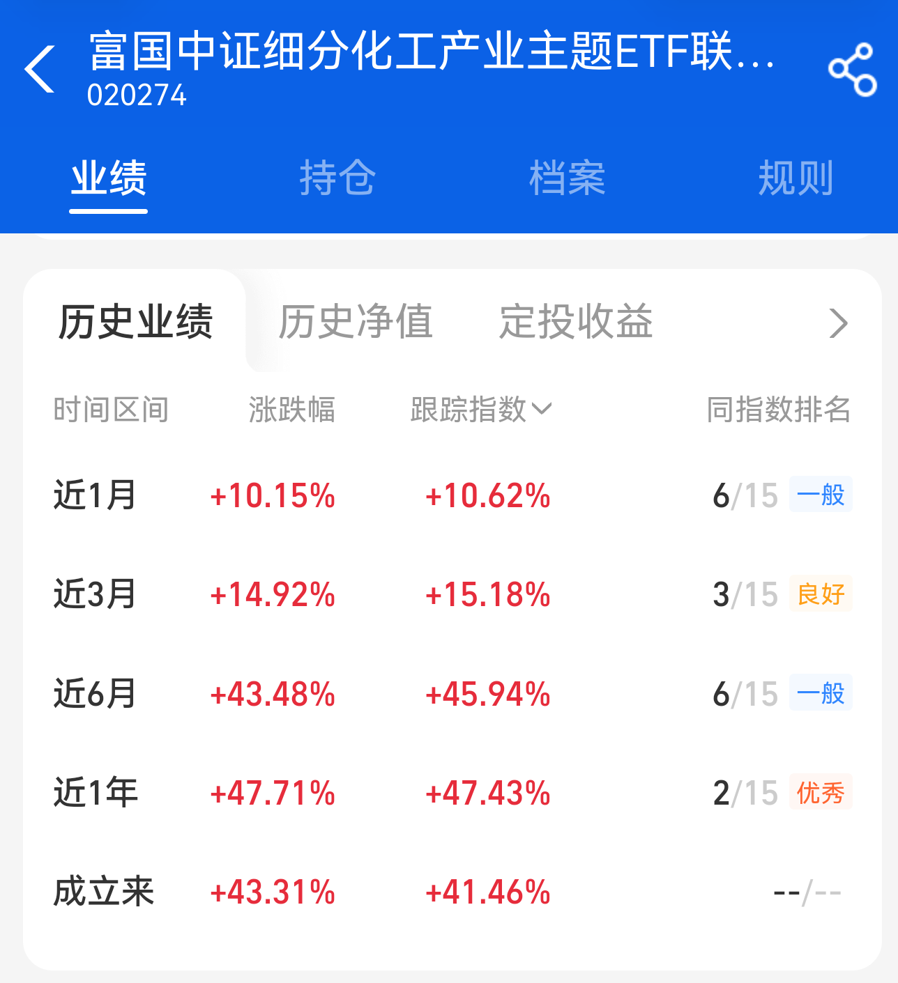富国中证细分化工产业主题ETF联接C(020274)紧跟行业复苏节奏,这只基金超90%资产投向对应ETF及成份股,紧密跟踪中证细分化工产业主题指数。截至昨日,基金最新净值1.4331,单日涨幅1.10%;近6个月斩获43.48%涨幅,近12个月收益达47.71%,成立以来累计上涨超43%。趁着当下市场热度和行业红利布局,期待能分享一波上涨收益。