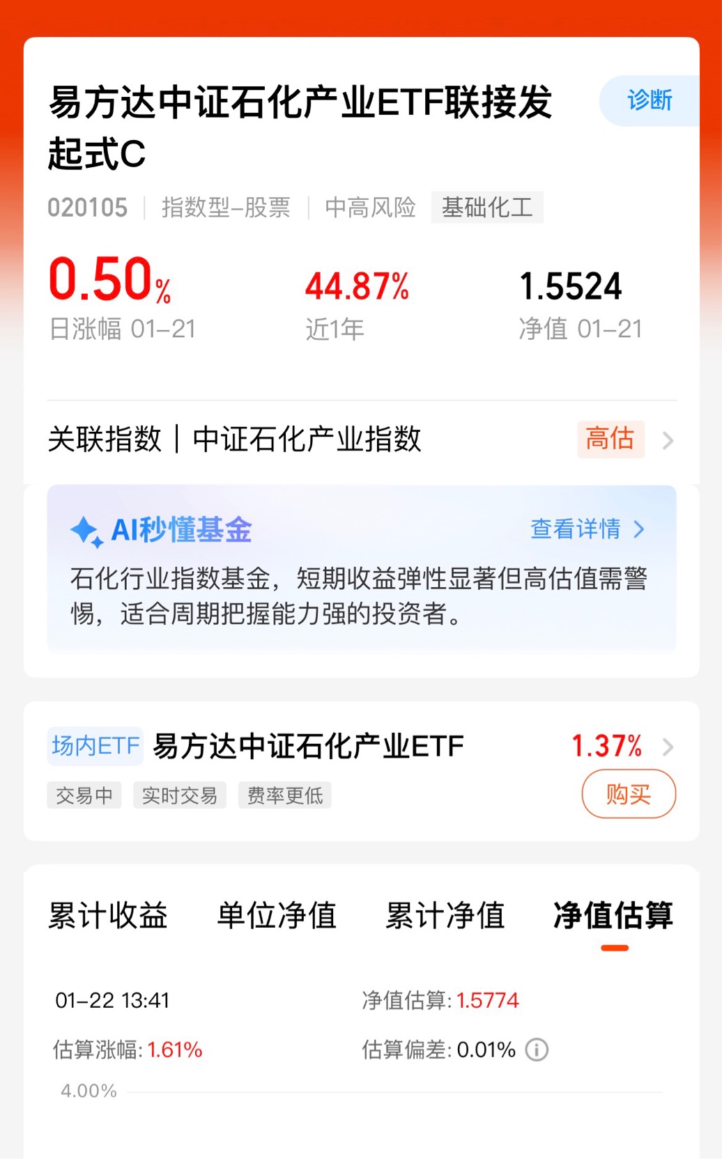 今年这个板块我觉得可能是黑马,因为在降期周期之内贵金属涨完以后,石油化工一般都可能会产生接力,近期化工板块走得非常漂亮,海外的能源类也都是大涨,我的$易方达中证石化产业ETF联接发起式C$ 今天估值又大涨,今天这个涨幅可能要比石化指数还要多