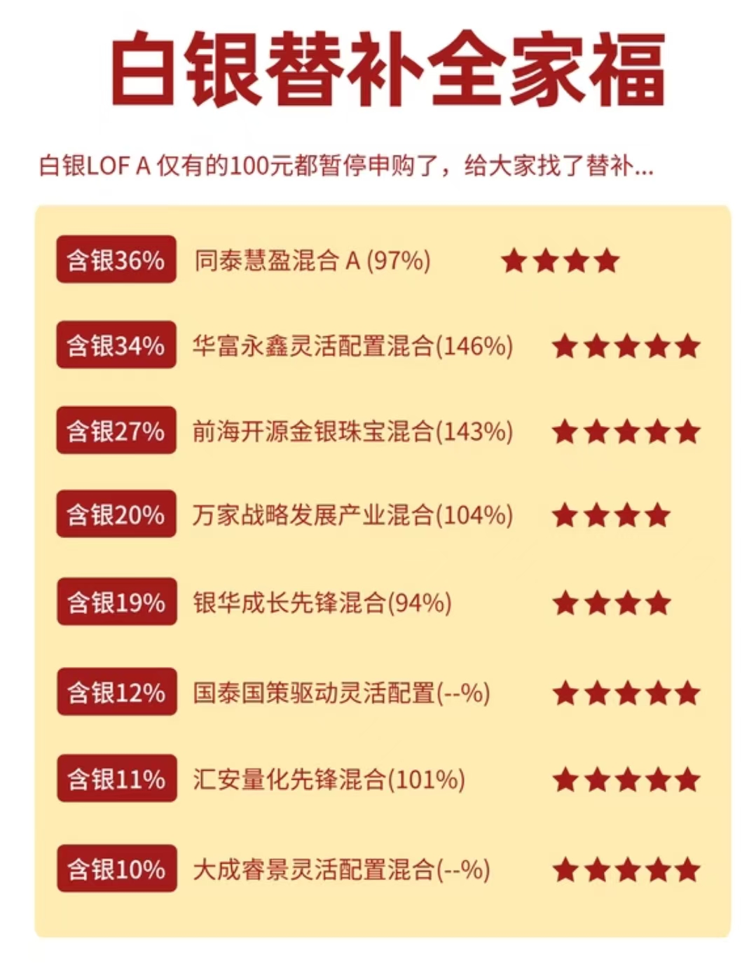 伦敦银现单日最高涨14%,国投瑞银白银LOF今日停牌且明日起暂停申购,上车通道关闭。宝藏白银代替的基金同泰慧盈(008178),持仓含银量同类最高,已12连涨,单日涨3.85%,近月涨37.04%,想蹭行情的重点盯牢~