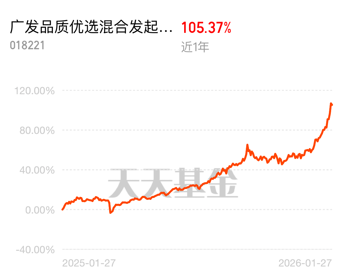 从上周贵金属那波暴力拉升就能看出来,行情还没。我早就说了,像广发品质优选混合C这种集中火力干有色的基,拿稳就行了,近一个月涨了快30个点,偶尔有波动也很正常,今天反弹上涨,弹性不错$广发品质优选混合发起式C$