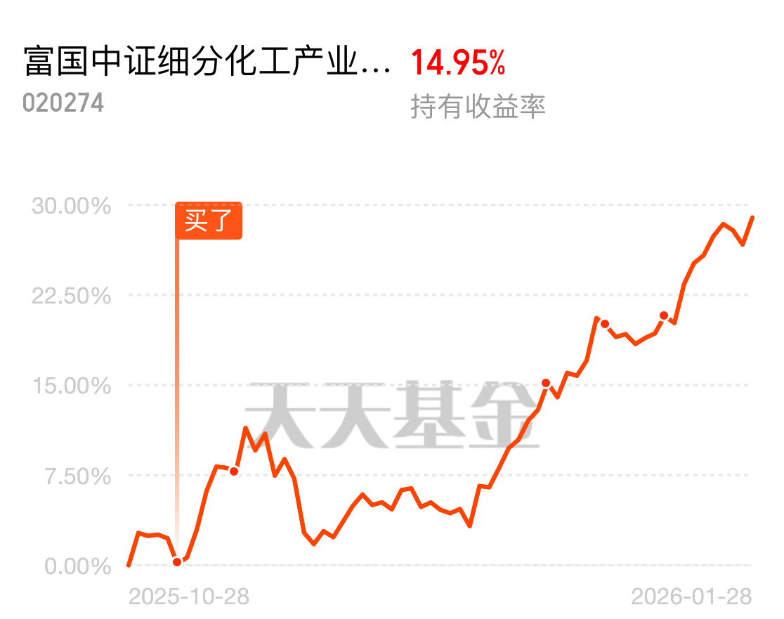赚15%了,这还不能说明行情真的来了吗?化工方向5连阳后回调了2天又开始上涨,小羊早就说了,化工方向可能会有一波主升浪行情,主要原因是原料企稳及产能优化推动,市场信心大幅提升,再观望下去可能要错过机会了,$富国中证细分化工产业主题ETF发起式联接C$ 该基金是被动指数型投资风格,聚焦基础化工和石油石化行业,覆盖龙头个成长性企业,包括了MDI、乙烯、PAT的部分细分高技术壁垒赛道,行业前景较好,上涨空间大,近一年收益率58.97%,近一个月反弹11.96%,远超同类平均水平,业绩表现一直很优秀,夏普比率2.94,优于94%的同类,性价比很高,小羊看好其长线逻辑和基金的布局能力,继续持有,继续持有。