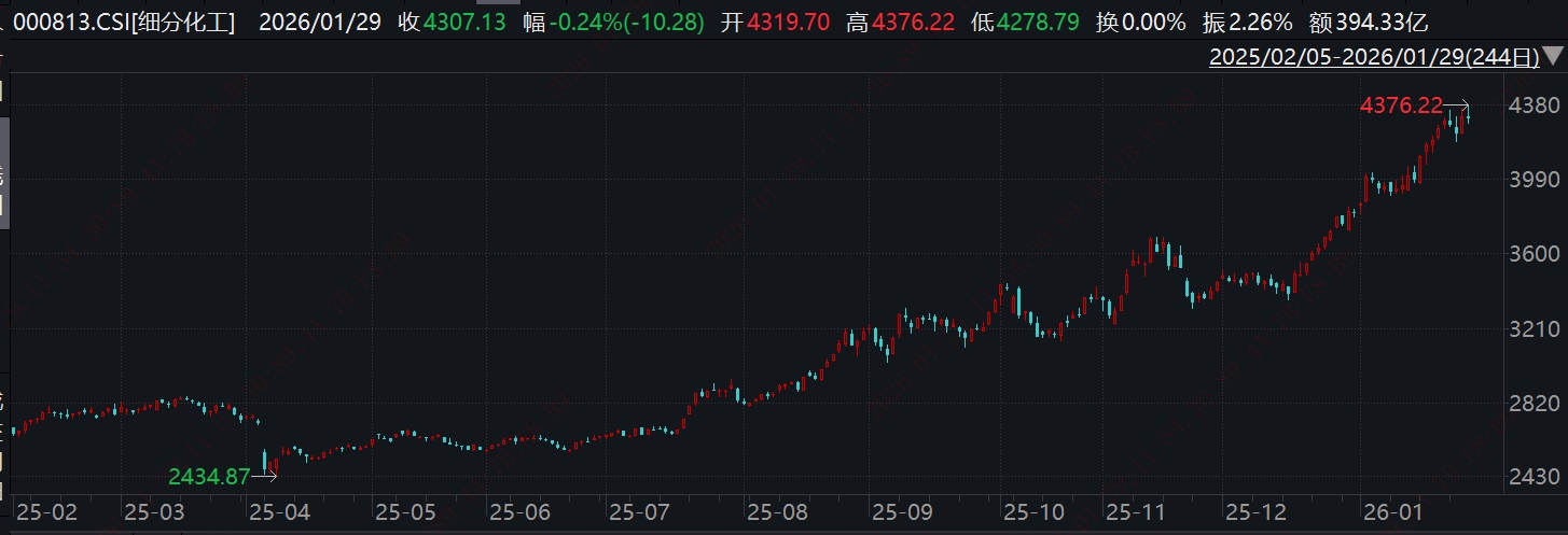前几天我写过一次化工,化工指数最近1年的走势确实亮眼,从最低点2400点涨到现在快翻倍了,尤其进入2026年以来,多次出现N连阳。