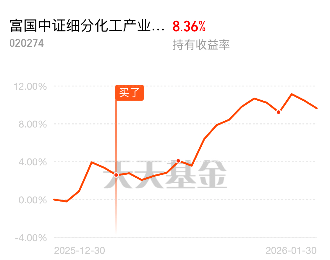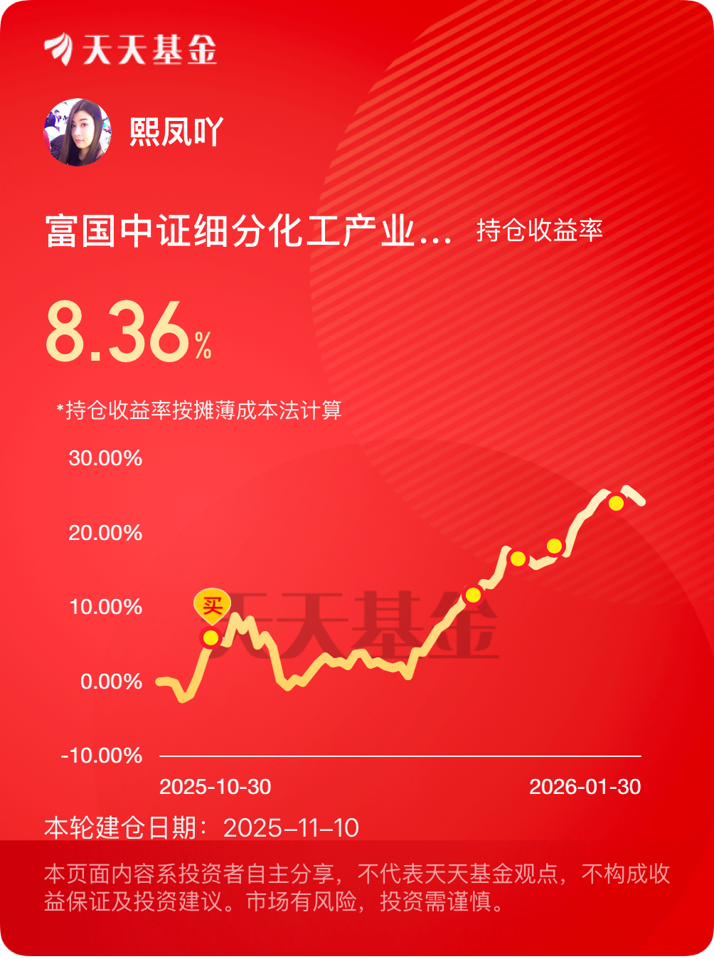 熙凤分批建仓的$富国中证细分化工产业主题ETF发起式联接C$ 目前收益已经达到了8.36%,这是一个聚焦化工细分领域的被动跟踪基金,布局的化工产业龙头企业。今天市场大幅低开后低走,市场情绪也很差,贵金属、有色、油气和煤炭等今天大跌,金银不用说,油气煤炭等大跌也有利空消息,川普和伊朗正在协商以达成协议,无法达成协议可能才会选择动手,所以避险情绪下降引发油气、煤炭等回落,不过川普讲一套做一套,真正要动手的可能是背后的犹太利益集团,可能不会轻易放过伊朗。现在年报在陆续出来,双碳政策是化工板块基本面得到改善,另外反内卷也让企业盈利得到提升,供需关系直接反转,化工的供需关系直接从过剩变成了紧平衡,企业不用再打价格战,盈利自然有了保障。另外26年以来,化工板块也成了香饽饽,北向资金连续十来天往里扫货,累计买了50多亿,说明资金也已经开始关注化工板块。这种调整很适合我们来加仓。#晒收益#