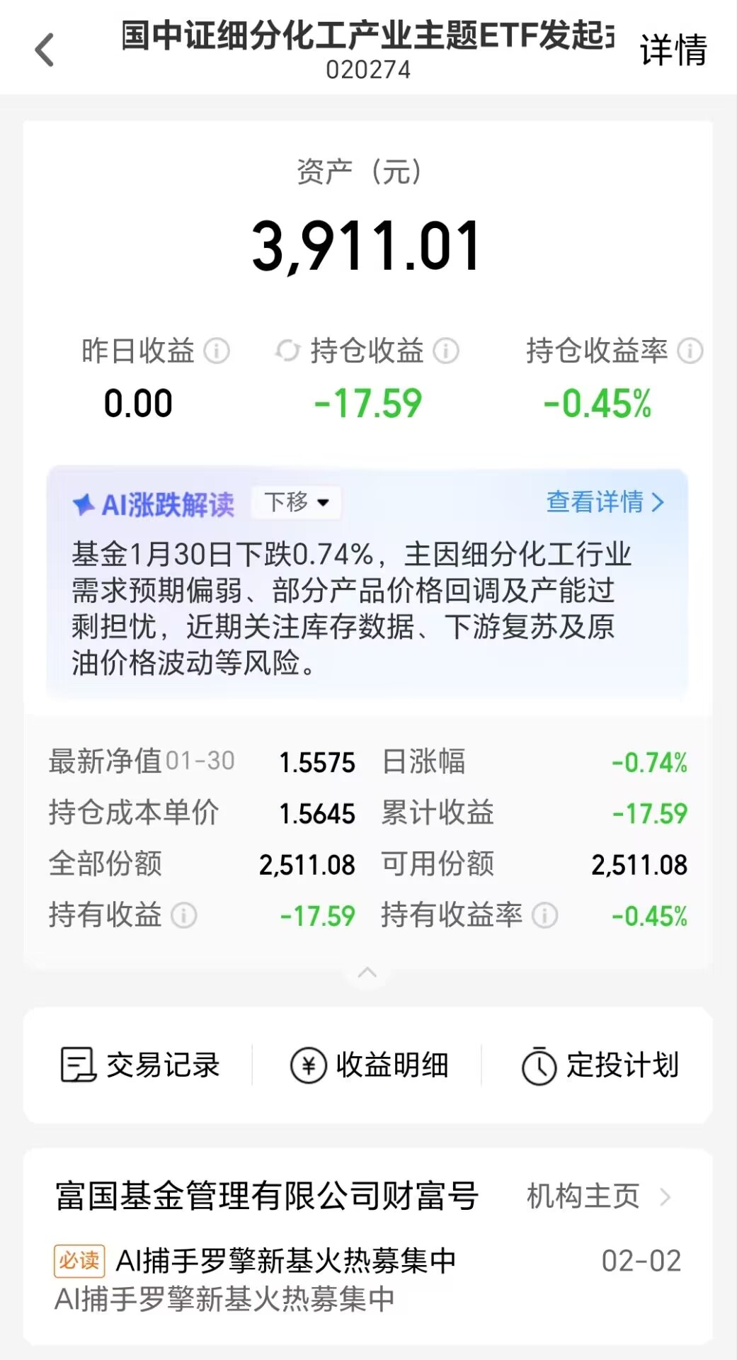 总的来说,流动性冲击只是暂时的,今天的调整就是错杀良机,保持耐心。$富国中证细分化工产业主题ETF发起式联接C(OTCFUND|020274)$